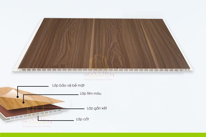 Tấm ốp Ngân Hoa 4173 được sản xuất từ nhựa Polyvinyl chloride (PVC), một loại polymer tổng hợp có đặc tính vật lý vượt trội. Điểm đặc biệt trong cấu tạo của tấm ốp này là dạng rỗng với các đường gân chịu lực bên trong, không chỉ giúp giảm trọng lượng đáng kể mà còn tăng cường khả năng cách âm, cách nhiệt hiệu quả. Đây là một lợi thế lớn so với các vật liệu đặc ruột truyền thống.